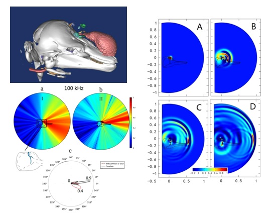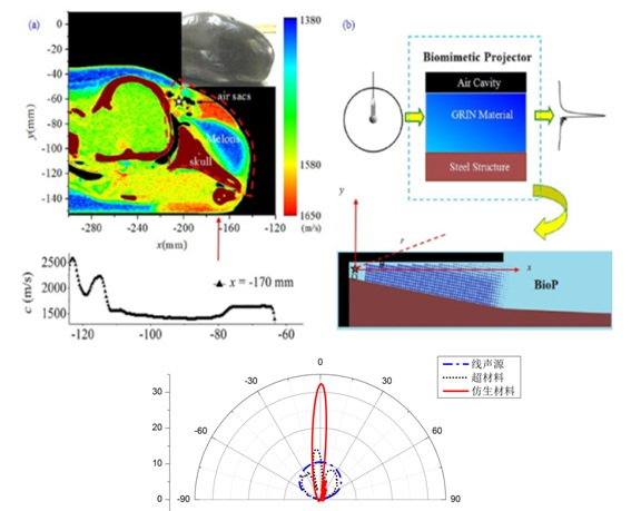 经过几亿年的进化和自然选择作用,鲸豚已经形成高效的生物声纳系统。近年来,通过对鲸豚发声机理的研究来了解生物声呐系统已成为海洋生物声学研究热点,对于海洋珍稀动物的保护和发展仿生声纳技术极其重要。实验室发展CT和MRI等医学断层扫描技术重建海洋动物的生物组织三维声学特性,生化变化和化合物定量分析。 通过理论和实验方法研究海豚复杂的声学结构在超声波束形成过程中的作用。深入研究生物声纳是如何实现减少噪声干扰,增加探测分辨率以及在目标方向上增大声波能量等优点。生物声纳性能研究对于发展新型水声信息与探测系统具有重要意义。