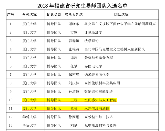 10月24日,福建省教育厅官网公示了2018年省级研究生导师团队入选名单,根据《福建省教育厅关于开展 2018 年省级研究生导师团队建设的通知》(闽教高〔2018〕31 号)文件要求,经各学科申报、高校推荐和教育厅审核,确定40 个团队为 2018 年省级博士生导师团队,56 个团队为 2018 年省级硕士生导师团队。由我室成员童峰教授(团队带头人)、许肖梅教授、程恩教授、孙海信副教授和江毓武教授组成的“水声信息与通信”团队成功入选省级博士生导师团队,我室王程教授领衔的“空间感知与人工智能”团队也