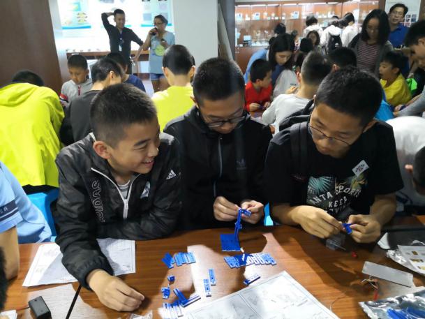 在爬行机器人组装体验环节,同学们亲自担任了一回“小小机器人设计师”,动手体验了一把机器人组装的乐趣,对机器人的构造特点也有了更深刻的理解。大家三人一组,齐心协力完成拼接任务,当机器人装上电池动起来的那一刻,一颗颗承载机器梦想的心也仿佛被引擎一同点燃。孩子们在系列活动中了解机器人、走近机器人、接触机器人,从小培养对科学浓厚的兴趣,发挥想象力,开拓思维,锻炼团队协作能力,与小伙伴、老师和家长共度美好的科普时光!