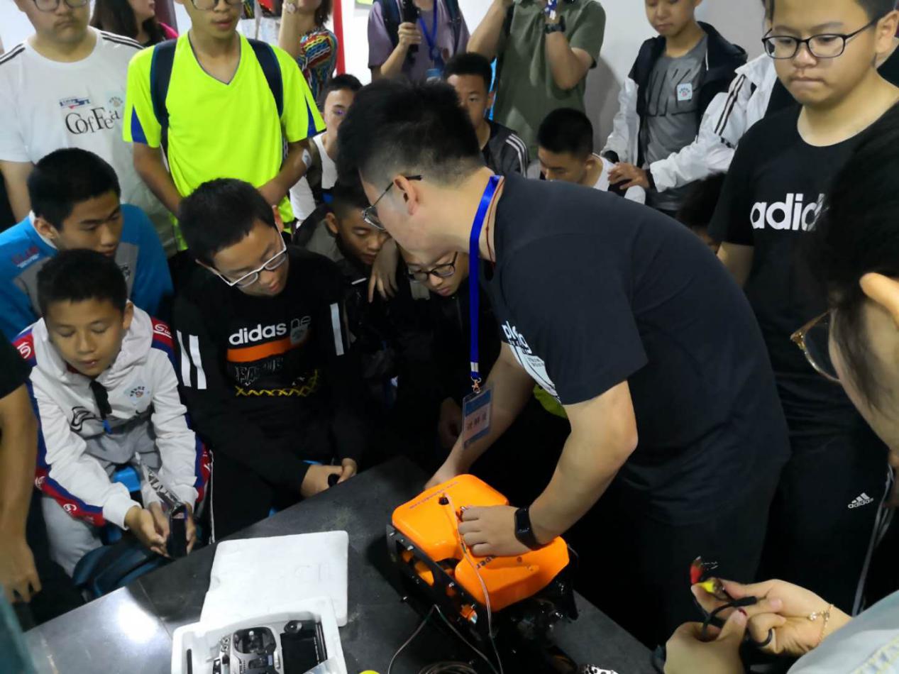 讲座结束后,志愿者向同学们现场演示了水下机器人的操作及原理,并指导大家进行了操作体验。
