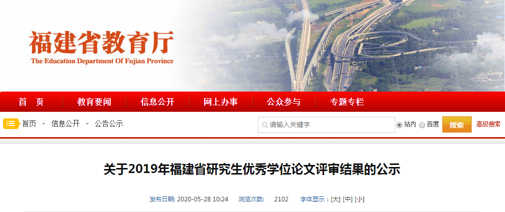 5月28日,福建省学位委员会在福建省教育厅官网公布2019年福建省研究生优秀学位论文评选结果,《关于开展2019年福建省研究生优秀学位论文评选工作的通知》(闽学位办〔2019〕16号)部署,经培养单位申报推荐、省学位办委托第三方机构组织学科专家评审,共评出2019年福建省研究生优秀学位论文274篇,其中优秀博士学位论文60篇、优秀学术硕士学位论文119篇、优秀专业硕士学位论文95篇。我室教师指导的2篇硕士论文获评优秀,名单如下: