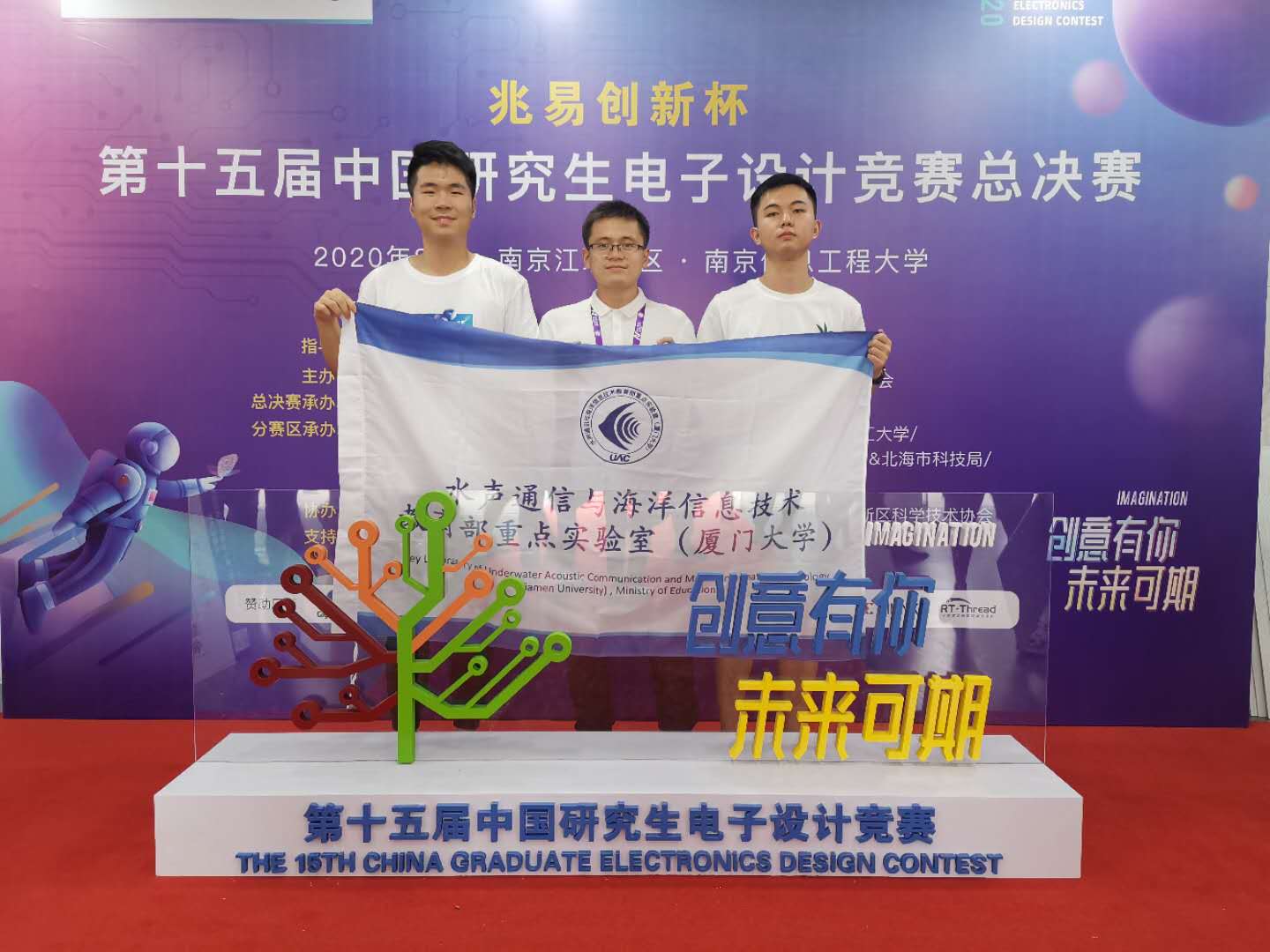 近日,第十五届中国研究生电子设计竞赛全国总决赛在南京信息工程大学圆满落幕,经过近5个月的积极备战,4天决赛的激烈角逐和严格评审,厦门大学入围总决赛的7个团队共荣获全国一等奖5项,二等奖2项,并获得最佳论文奖1项,商业赛最具商业价值奖1项。厦门大学在该项赛事中进入国赛的队伍数和获得一等奖的奖项数取得了历史性突破,荣获全国“优秀组织奖”。其中,我室研究生的参赛作品“水声实时语音识别原型机研制”(指导老师:王德清、解永军)获得华为专项赛全国一等奖,“‘水瞳’智能水下自拍器”获得技术类竞赛全国二等奖、最佳论文奖(指导老师:袁飞、朱逸)。