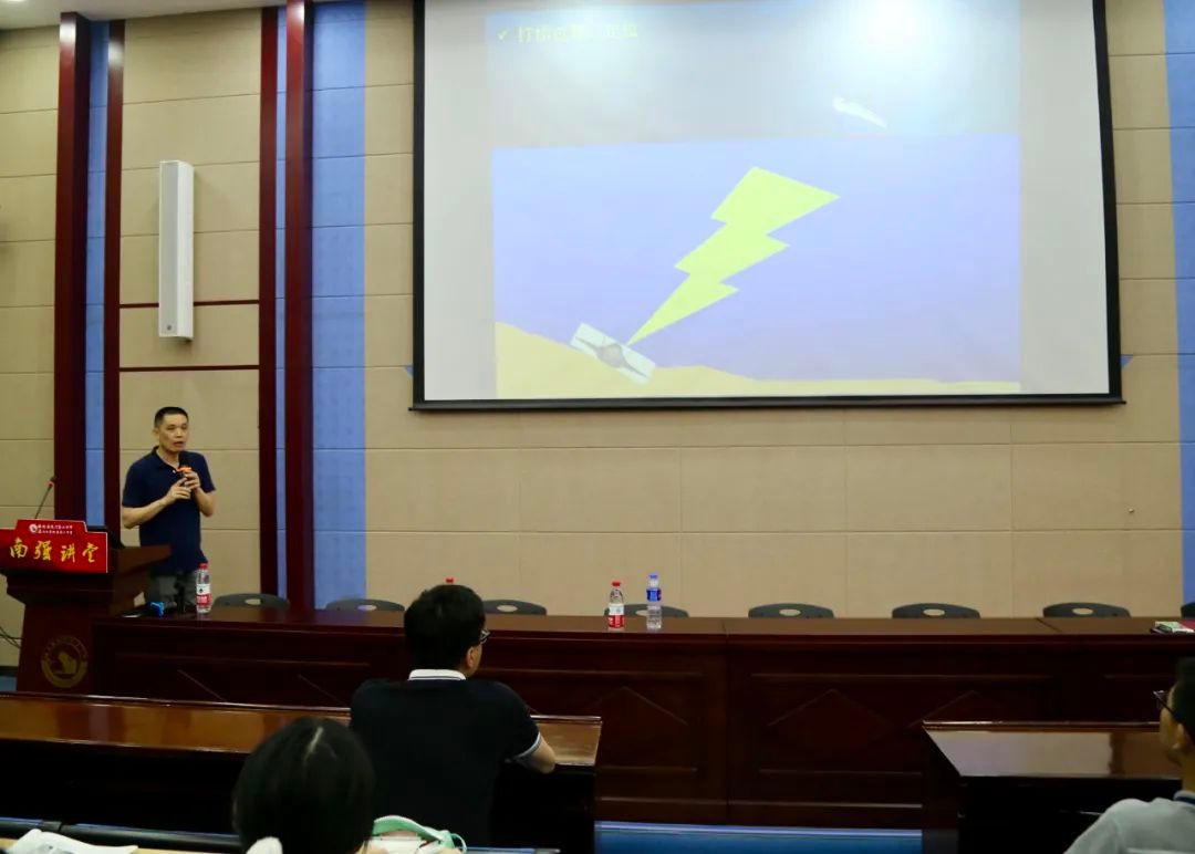 为什么要研究水下机器人?采集到的信息如何传回母船?童峰教授在讲座中,用“鱼鳔”、“遥控车玩具”、“滑翔机”等学生熟知的比喻,用生动有趣的时事新闻为引例,解释了各类传声技术的特点和设计思路,更为学生们清晰地梳理了水下传声技术的实际应用,构建了一个清晰鲜明且完备的“水下传声系统”体系。