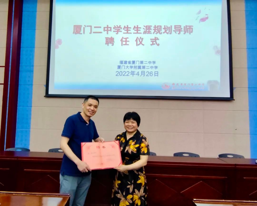 为了更好地对学生进行生涯规划指导,厦门二中特聘童峰教授为学生生涯规划指导老师,厦门二中党委书记、校长王守琼为童峰教授颁发聘书并合影留念。