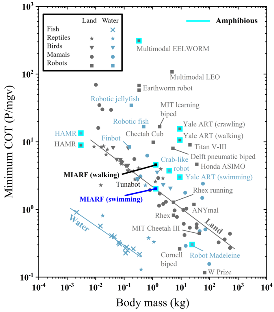 基于以上弹涂鱼的两栖运动特性,研究团队研发了一种仿生弹涂鱼两栖机器人(MIARF)(图1)。该机器人能够根据水陆两种不同的运动环境采用不同的运动模式,通过胸鳍-尾鳍的协调作用来实现陆地及水下复杂环境中的高能量效率与高机动性。