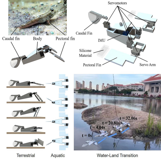 近日,厦门大学海洋与地球学院、水声通信与海洋信息技术教育部重点实验室张宇教授团队及其合作者在跨介质机器人领域取得重要进展,相关成果以“Mudskipper-inspired amphibious robotic fish enhances locomotion performance by pectoral-caudal fins coordination”为题发表于Cell旗下物质科学期刊Cell Reports Physical Science. 此次研发的仿生弹涂鱼两栖机器人能够实现较好的多功能性和环境适应性,为研发新型仿生两栖机器人提供了重要参考。