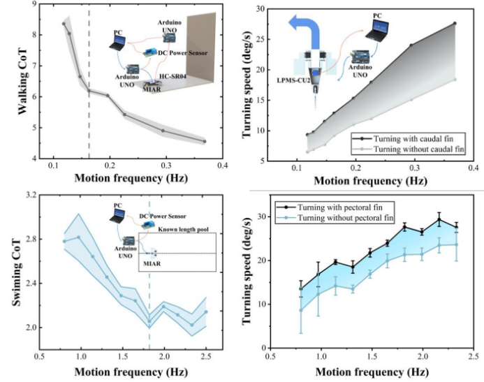 研究团队还对比了仿生弹涂鱼两栖机器人和两栖虫型机器人(Multimodal EELWORM)、哈佛移动微型机器人(HAMR)、耶鲁两栖机器龟(Yale ART)等常见两栖机器人的运输成本(Cost of Transport, COT)。结果表明,仿生弹涂鱼两栖机器人的两栖运动效率优于大多数的两栖机器人,特别是水下的运动效率。同时,与单模态机器人例如单模态虫型机器人(Earthworm robot)、水母机器人(Robotic jellyfish)等相比,仿生弹涂鱼两栖机器人在对应的模态运动中的运动效率也高于部分单模态机器人(图2)。此外,其在陆地和水中的转弯速度分别提高了50.1%和24.4%(图3),说明通过胸鳍和尾鳍的协调作用有效提高了仿生弹涂鱼两栖机器人在两栖运动环境中的机动能力。水陆两栖机器人具有巨大的应用潜力,该研究为开发先进的多用途机器人系统提供了有价值的见解。