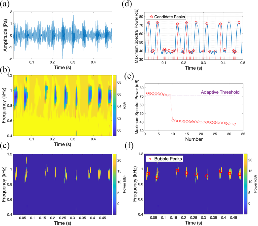 该研究旨在利用被动声学监测器(Passive Acoustic Monitor, PAM)实现海底气体渗漏量的估计。被动声学监测器测量海底气体渗漏速率是一种极具发展潜力的技术,它能通过监听声信号检测渗漏气泡的振荡频率,并由此估计渗漏气泡体积和气体渗漏速率。由于渗漏气体产生声信号能量微弱,距离海面较近的被动声学监测器很容易受到海洋环境噪声的干扰,包括海面风浪噪声、船舶途径噪声等。为了解决海洋噪声干扰问题,该研究提出一种噪声鲁棒的稀疏时频表达算法,通过追踪时频图上噪声变化趋势,增强时频图上渗漏气泡的声信号;通过对比时频峰能量的方式自适应设定幅度阈值,检测每个渗漏气泡声信号的谐波频率,估计海底气体渗漏速率。该研究有效推进了被动声学监测器在测量海底气体渗漏速率应用上的可靠性,为气泡声信号处理相关领域奠定了重要的技术基础。