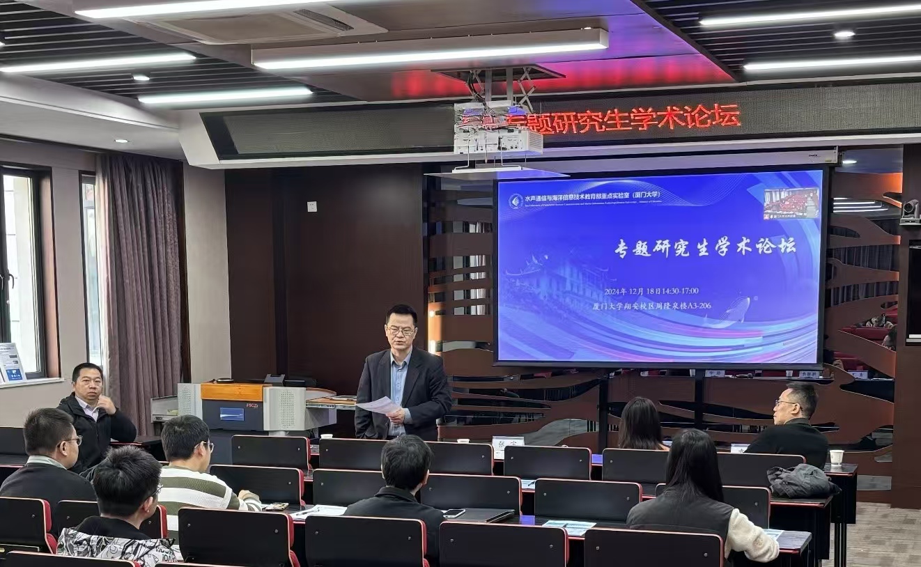 当天下午,实验室主任张宇教授在周隆泉楼A3-206会议室主持实验室专题研究生学术论坛,实验室副主任袁飞、陈友淦、陈丽丹及实验室师生代表合计40余人参加了交流。来自海洋与地球学院、信息学院、物理科学与技术学院、萨本栋微米纳米科学技术研究院6位专业背景各不相同的研究生,分享各自在海洋技术领域的研究进展。会场学术交流气氛轻松而热烈,实验室期待未来年轻学子间的“海洋+X”“X+海洋”能成为常态,我们将持续为校内不同学科背景聚焦水下应用场景的融合探索搭建广阔的交流平台。