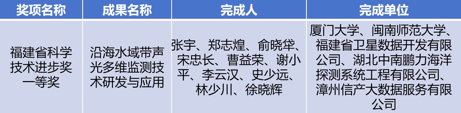 福建省人民政府于2025年1月24日发布《关于2023年度省科学技术奖励的决定》,授予23项成果“福建省科学技术进步奖一等奖”。其中,由厦门大学水声通信与海洋信息技术教育部重点实验室主任张宇教授牵头,联合福建省卫星数据开发有限公司、闽南师范大学、湖北中南鹏力海洋探测系统工程有限公司、漳州信产大数据服务有限公司等多家单位共同完成的“沿海水域带声光多维监测技术研发与应用”项目,荣获该奖项。