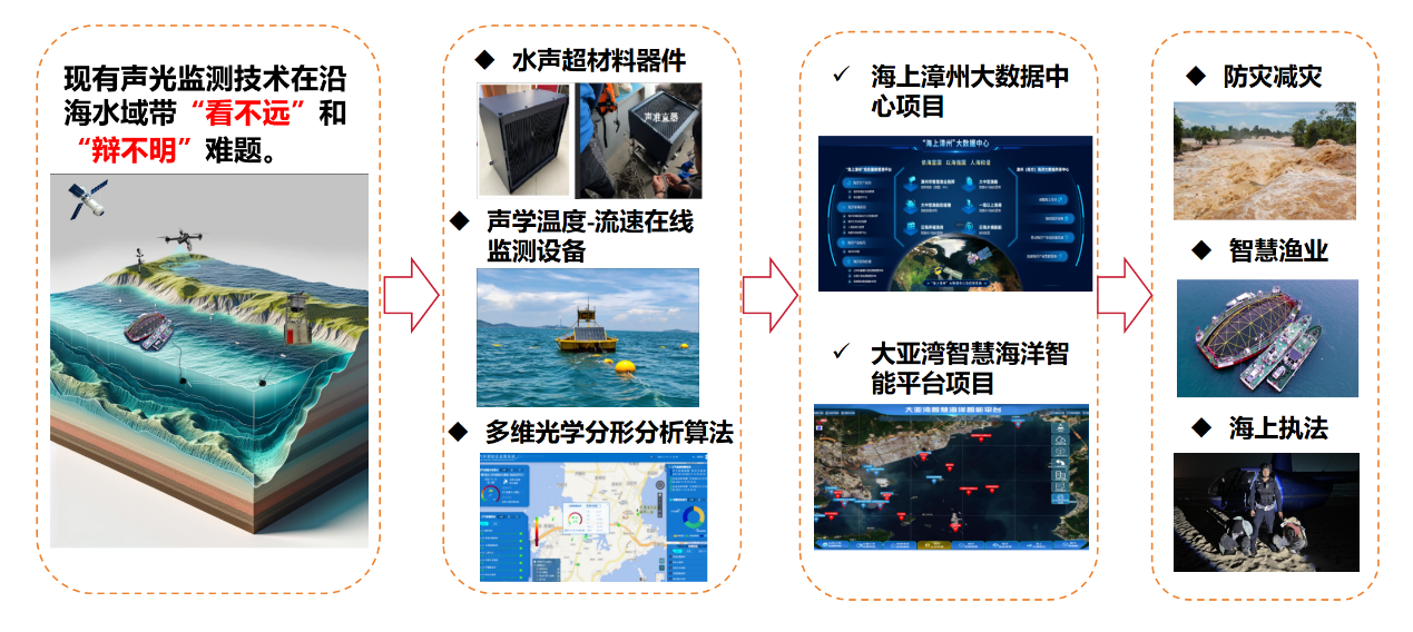 该项目针对近海复杂水域干扰大、常规声学技术监测距离显著下降的难题,成功突破沿海水域带声光多维监测的关键技术。团队研发了国内首款浅海水超声材料波束控制器件,揭示了沿海水域带分形特性的非线性演变规律,填补了沿海水域带流速-温度实时、同步监测的国产设备空白。