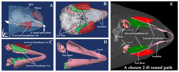 鲸豚声呐系统的高效性吸引着科学家们进行大量的基础研究工作。近年来,张宇教授课题组关于鲸豚回声定位系统的基础研究工作得到了国内外关注,也为仿生声呐工作的推进提供了参考。张宇教授和他的博士研究生宋忠长、助理工程师徐晓辉,美国伍兹霍尔海洋研究所的T Aran Mooney副教授、Adam B Smith博士以及国家海洋局第三海洋研究所的王先艳副研究员开展国际化、跨学科合作研究。这项合作成果表明了江豚在声接收过程中存在着新的一条由固体结构和软组织结构组成的传播通道。这项研究为以往海豚下颌声接收理论提供创新认识,对加深鲸豚声学接收机理研究奠定了良好基础。该成果表明江豚不仅在头部发射系统利用头部内软物质组织结构和头骨固体结构等多相复合体来传输声波,还充分利用了组织特性各异的多相介质来传导声波。该研究成果将实验室工作从鲸豚的发射系统扩展到接收系统,为今后进一步研究打下良好基础。