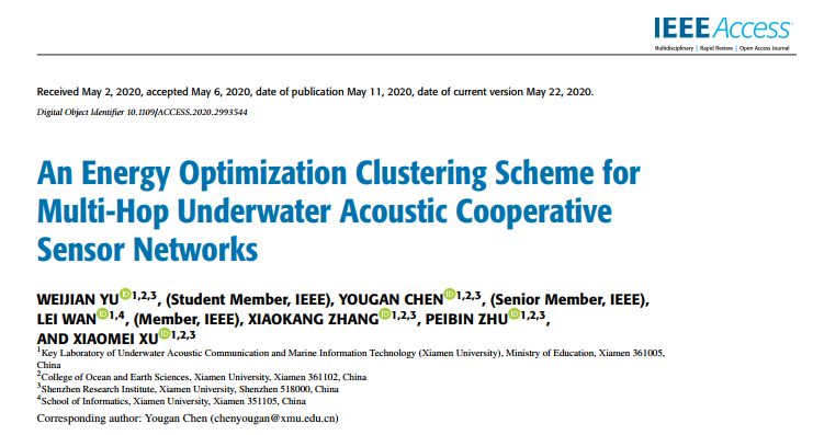 2020年5月11日,陈友淦副教授课题组在国际著名交叉学科期刊《IEEE Access》上发表了题为“An Energy Optimization Clustering Scheme for Multi-hop Underwater Acoustic Cooperative Sensor Networks”的研究论文,提出了一种用于多跳水声协作传感网能量优化的分簇算法。