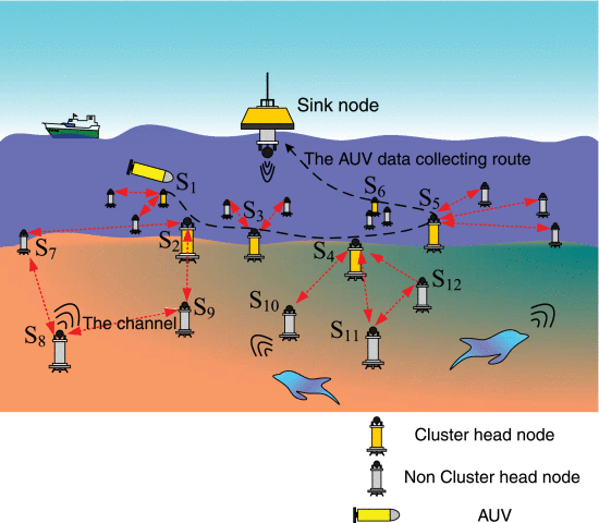 适用EOCA分簇算法的多跳水声协作传感网示意图