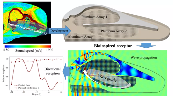 江豚在复杂水下环境高效地探测和跟踪猎物,离不开其强大的声接收系统。江豚声接收系统具有多相、多通道声传输特性(Bioinspiration & Biomimetics, 2019, 14: 016004),如何采用新材料重建其声学超结构对于揭示江豚声呐机理有重要理论意义。张宇教授和宋忠长博士、张闯、张金虎、欧文湛等研究生在这方面取得突破性进展,提出了江豚声接收的物理模型。该研究基于江豚声接收物理原理,结合江豚计算机断层成像、3D打印与人工超构材料技术重建江豚声接收物理模型,并通过声场模拟仿真与实验测量证明了该物理模型的多通道、指向性声接收特性。其研究成果可为智能声呐设计提供重要技术支撑,为海洋探测技术和高端设备研发提供了新原理和新方法。