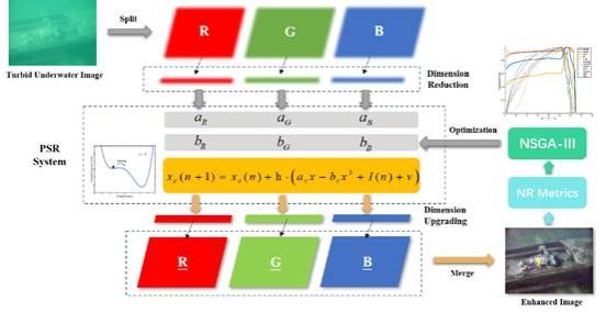 文章为了解决上述问题,提出了一种基于参数调谐随机共振(PSR)的水下浊度图像增强方法,该方法不需要先验假设和大量的数据驱动,可以同时适应不同类型的浑浊水体。首先,文章从弱信号增强的角度出发,设计了一个基于PSR的图像增强算法框架。为了给随机共振(SR)系统的参数调谐提供可靠有效的依据,文章还构建了一个根据水下成像模型合成的浑浊水下图像数据集,以探究SR系统对浑浊水下图像的输出响应与各种类型图像质量评价指标之间的关系。根据得出的结论,为SR系统设计了一个自适应的参数调整策略,以指导图像的增强过程,保证系统输出的性能。最后,在多个基准数据集上和各类自然水体中的评估实验表明,与各类水下图像增强的SOTA方法相比,所提出的方法不仅在提高水下图像质量上有优异的表现,而且能够更好地提升下游任务的性能。