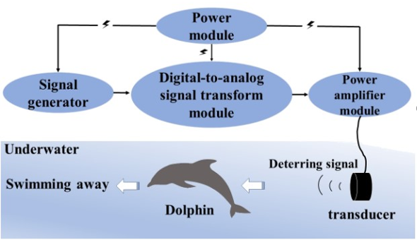 针对这一重大问题,张宇教授团队基于鲸豚听觉原理,研发了一种海豚声学驱赶—保护设备(图2),驱使点斑原海豚游离深海渔业作业区域,从而避免误捕。从2019年开始,该团队与南海水产研究所展开合作,在南海渔业作业中对热带点斑原海豚进行现场“声驱赶”试验。