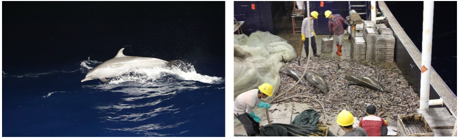 鲸豚生物的种群保护和恢复是一个倍受关注的全球性问题。我国南海是鲸豚重要栖息地之一,拥有着全球超过三分之一的物种。然而,密集的渔业活动导致鲸豚误捕、致死现象频繁发生(图1),给物种保护及种群发展带来巨大挑战。如何在发展深海渔业经济的同时,避免对鲸豚造成伤害,是远洋渔业可持续发展的重要问题。此外,生活在淡水水域的长江江豚与浅海近岸海域的中华白海豚等作为我国珍稀鲸豚物种,与人类活动交叉区域大,面临威胁较大,因此对其开展声学保护意义重大。