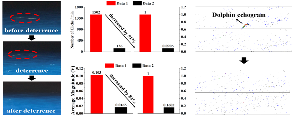 结果表明,在声驱赶设备开启20分钟后,海豚发出的声呐信号脉冲数量下降91%,幅度下降84%,且视野范围内的海豚数量为0,充分表明设备可迫使海豚迅速游离渔业作业区域,而渔获量基本不受影响(图3)。设备在保护海豚的同时不会对渔业捕捞活动产生不利影响,从而起到了良好的“驱赶-保护”作用。该成果为研发仿生声学驱赶设备,服务智慧渔业及开展鲸豚声学保护奠定了基础。