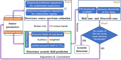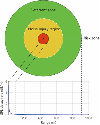 针对上述问题,许肖梅教授团队创新性地将声驱赶与工程施工紧密结合,针对海洋工程水下爆破场景,提出以水下爆破中的导爆雷管为驱赶声源对海洋哺乳动物实施保护。通过微小当量导爆雷管的水下爆炸产生脉冲式驱赶信号,驱赶信号受离散参数配置的声源与海洋环境的随机变化影响而具有较强的随机性;通过导爆系统控制声驱赶与工程爆破间的时间,使保护的海洋哺乳动物有充足时间逃离。在此基础上,论文基于水下爆炸声传播理论与BELLHOP水声传播模型,将声源参数、施工海域环境参数及被保护动物听觉特征三者有机结合,构建了一种新型驱赶声场区间控制模型,仿真研究了同声传播下的声场预测结果,较好地验证了海上实测结果。依托该模型,通过调整声源参数可实现对驱赶声场的“危险区”与“作用区”分布的有效控制(图1所示)。图2为驱赶声场区间控制模型原理图。